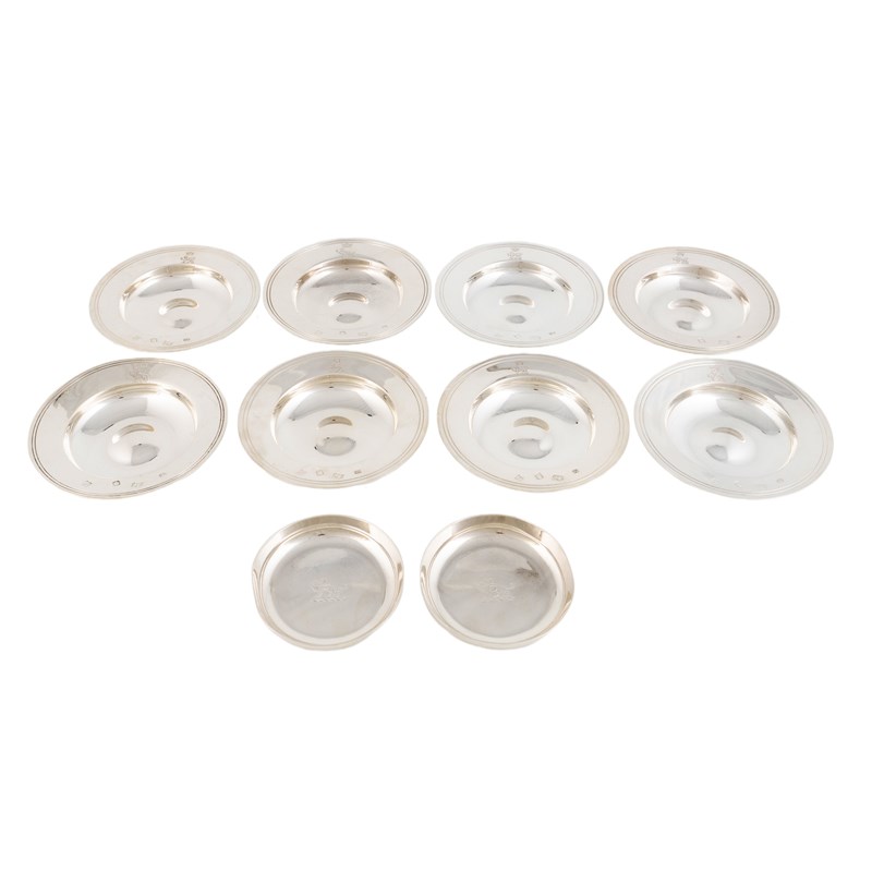 plain circular form engraved with crowned crests, diameter 11.6cm, plus two modern silver dishes by Asprey & Co Ltd, London 1959, total approx. weight 31.9oz. (10)