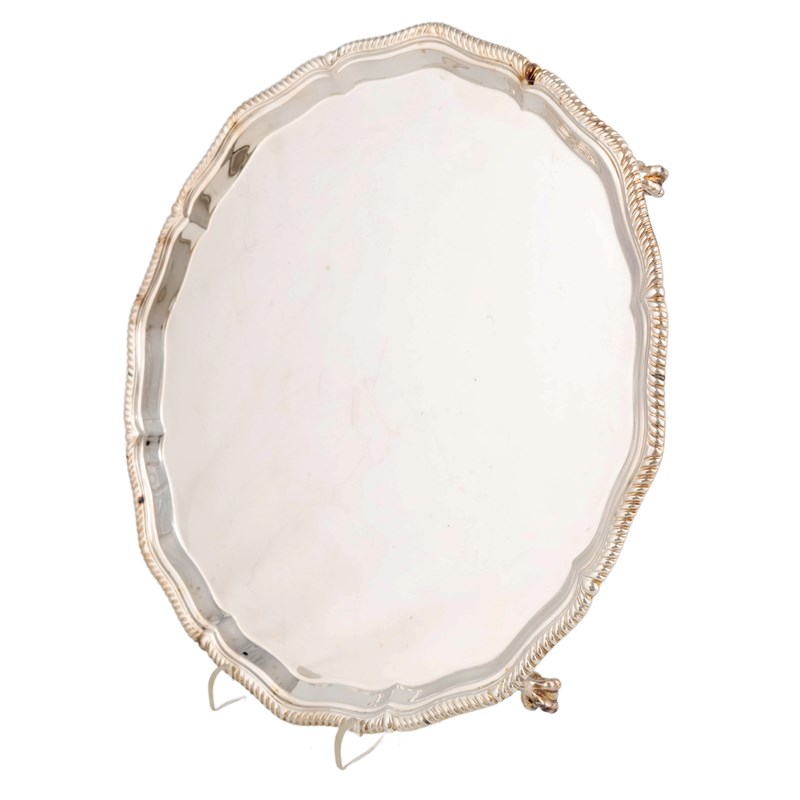 shaped circular form with a gadrooned border, on four claw and ball feet, diameter 25.2cm, approx. weight 19.6oz.