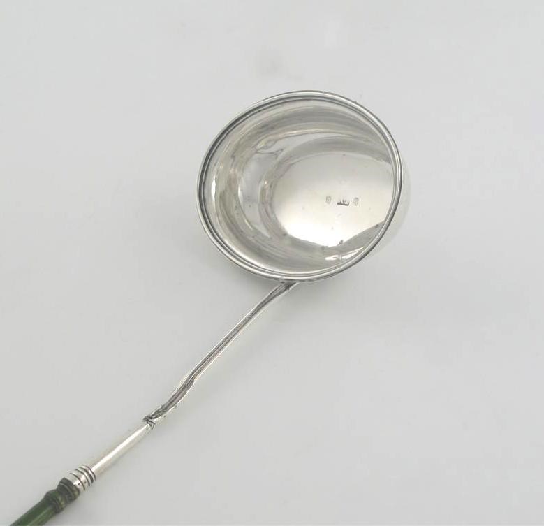 A George III punch ladle, with reeded borders and a turned, green stained ivory handle, by Thomas Meriton, London 1791, 15in (38cm) long.
