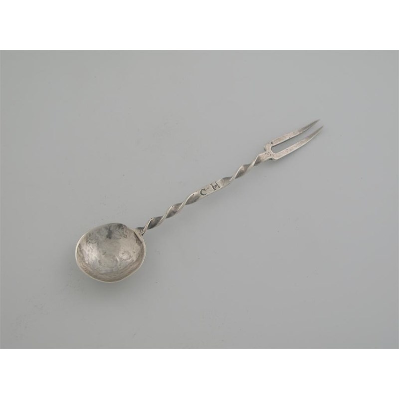 A sucket spoon and fork, initialled 'C H', struck with an indeterminate mark, 5.4in (13.7cm) long.