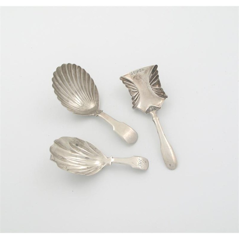 Three caddy spoons: a William IV Fiddle example, with a fluted bowl by Francis Powell, London 1834, a similar example with stiff leaves in the bowl, same maker, London 1820 and another example with a hollow Fiddle stem, by Thomas Millington, Birmingham 1829. (3)