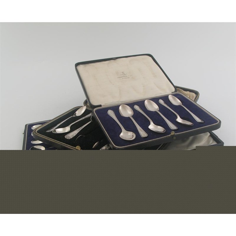 Three cased sets of flatware: a set of twelve modern 'bean-end' coffee spoons