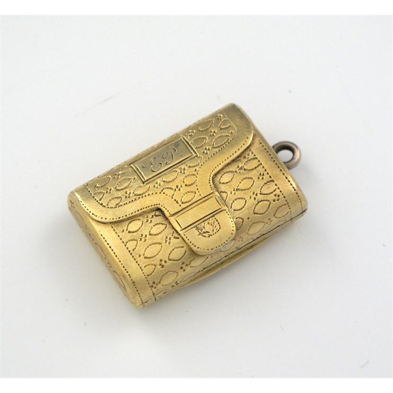 A George III silver gilt 'purse' vinaigrette, with 'pricked' work to simulate stitching, initialled 'E P', suspensory ring, by John Shaw , Birmingham 1816, 1.25in (3.2cm) long.