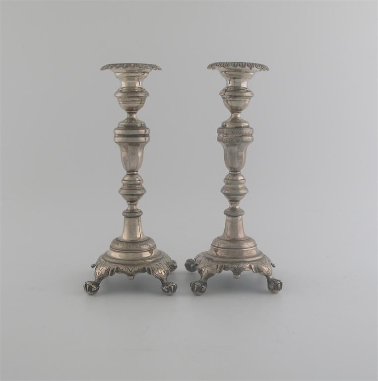 **A pair of early 19th century Brazilian candlesticks, on four ball and claw feet, with shaped, domed square base, knopped and faceted columns, with stamped decoration, makers mark 'F L' or 'F G?', 9in (23cm) high, 20oz. (2)
