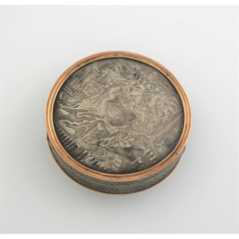 **An 18th century Russian niellowork and gold mounted circular snuff box and cover, with a trophy of arms on the base and St George and the Dragon on the cover, gilt interior, engraved with a Barons coat of arms and motto 'VIX.EA. NOSTRA.VOCO', by unknown maker, Moscow 1795, 32in (8cm) diameter, 3.5oz.