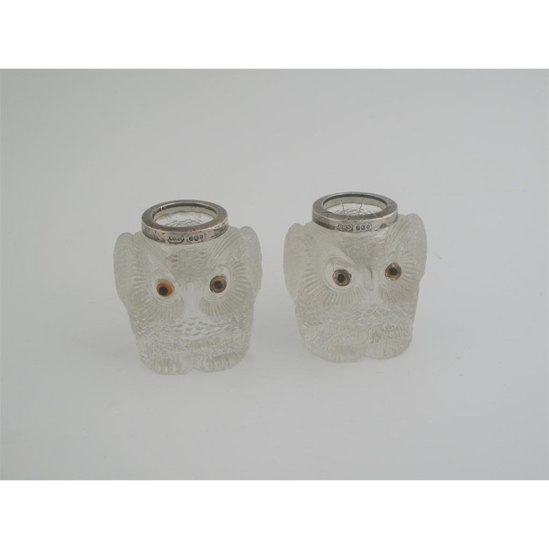 A pair of Edwardian vesta holders, in the form of mounted moulded glass owls, with coloured eyes, registered design No's on the base, by W. H. Sparrow, London 1907, 2.8in (7cm) high. (2)