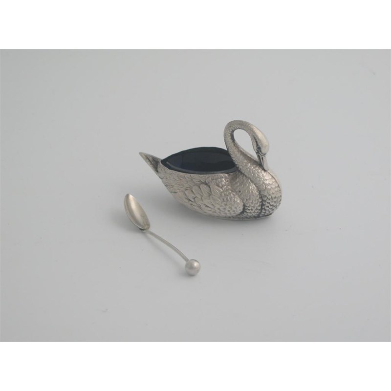 An Edwardian novelty salt, in the form of a swimming swan, with blue glass liner and matching spoon, by Adie & Lovekin, Birmingham 1907, 2.8in (7.2cm) long, 0.5oz weighable silver.