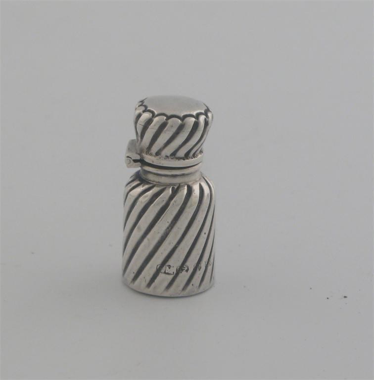 A Victorian, small, scent bottle, decorated all over with spiral fluting, hinged cover, glass stopper, by Charles May, London, 1873, 1.26in (3.2cm) high.