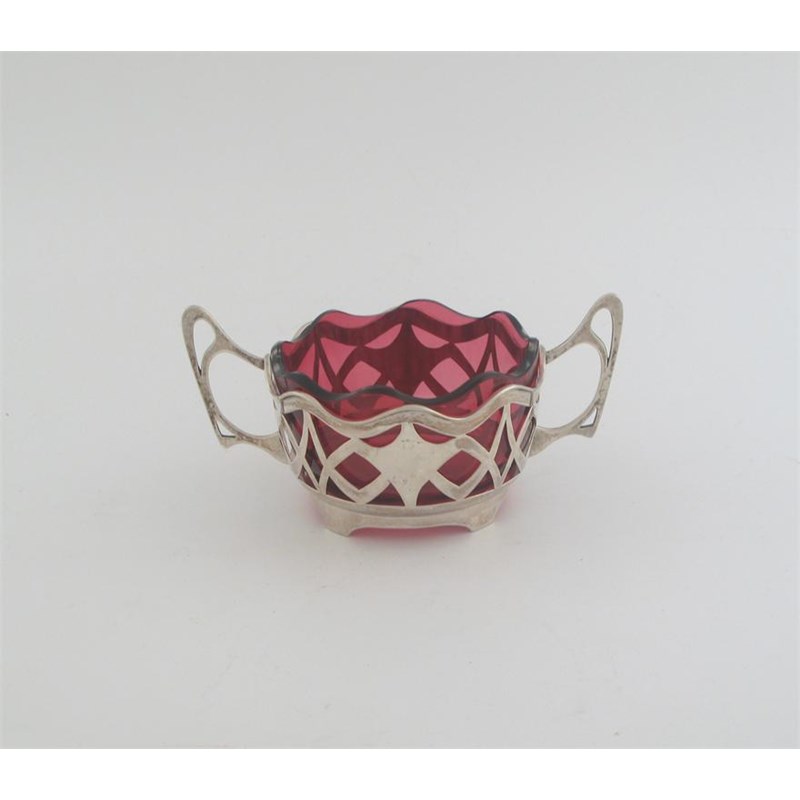 A German art nouveau small pierced dish holder, with two handles and a cranberry glass liner, struck also with a Russian state mark, c.1910, 6in (15.2cm) wide, 3oz.