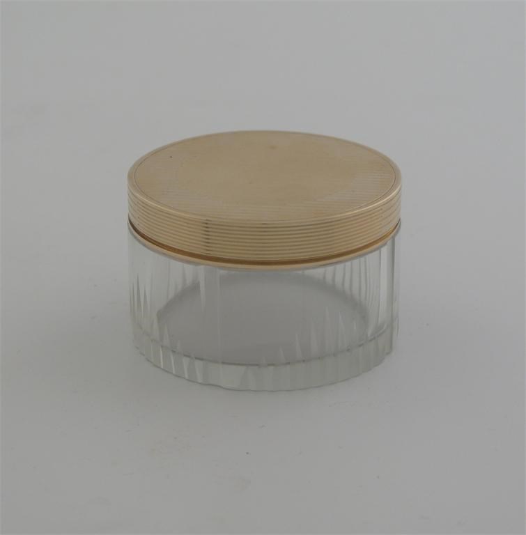 A modern 9ct gold mounted glass dressing table jar, with a reeded screw cover, by Asprey & Co, London 1938, 2.5in (6.1cm) diameter.