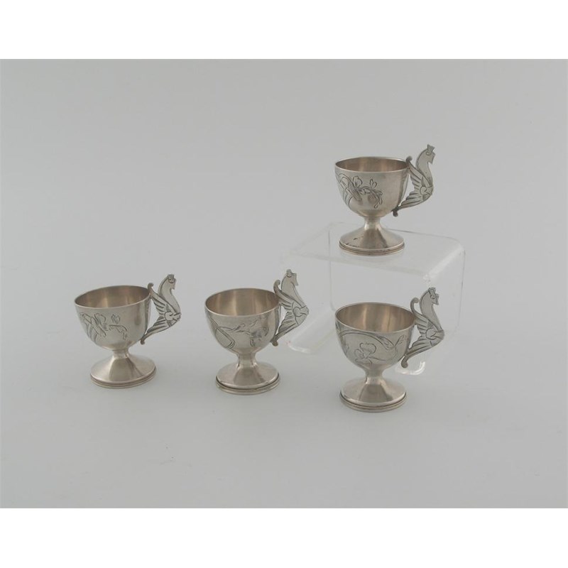 A set of four engraved Russian vodka cups, with stylised 'cockerel' handles and pedestal bases, possibly by I.D.Prokefiev, Moscow 1908-17, 2.6in (6.6cm) high, 4.25oz. (4)