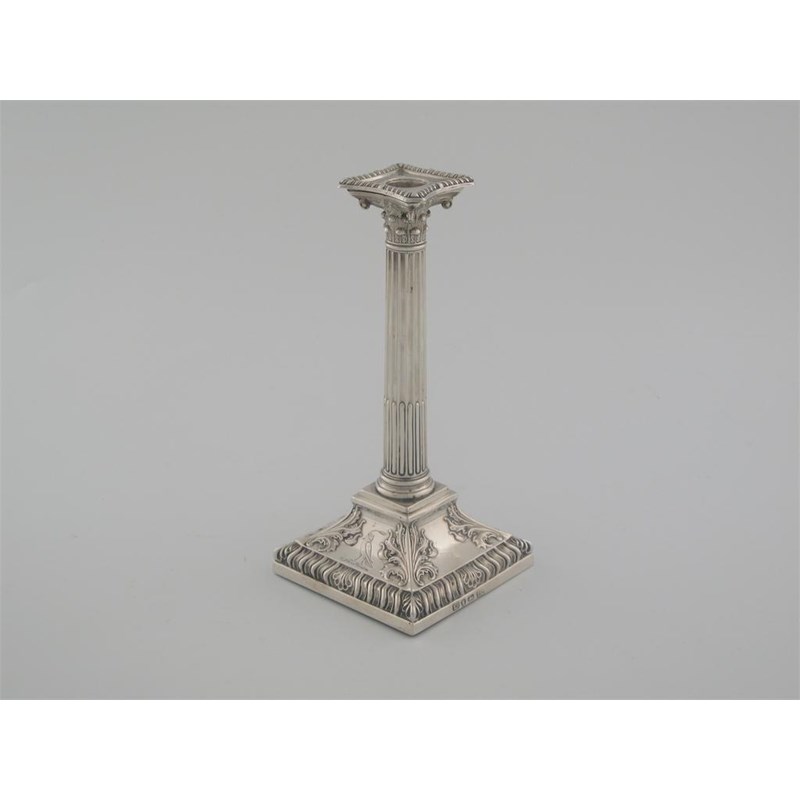 A George III taperstick, with a Corinthian column, detachable nozzle and a bevelled square base, with gadrooning and foliage, by John Carter, London 1769, (wooden inset base), 7.1in (18cm) high.