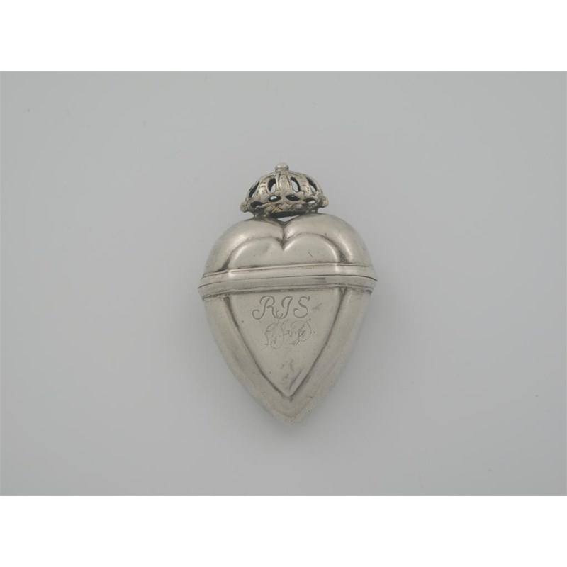 A early 18th century Scandinavian hovedvansaeg, heart shaped with an openwork, gilt, coronet finial, initialled, struck twice with assay masters mark and date 'NF.1729', probably Danish, 2.6in (6.6cm) high, 2oz.