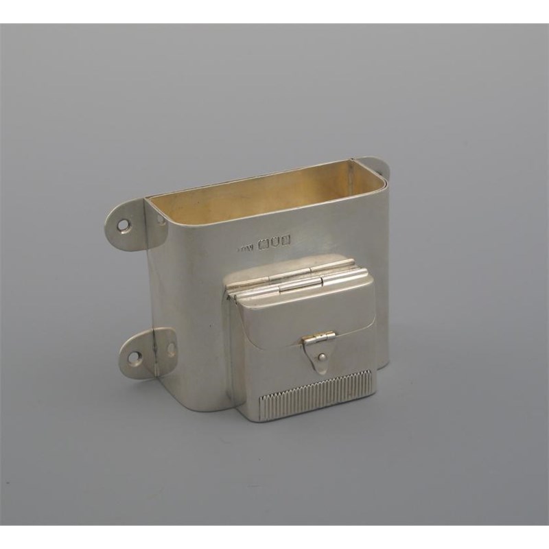 Motoring interest: A modern ash tray and vesta box combined, with internal pivoting cover, lift out liner and four screw holes (for mounting inside a vintage car or carriage), by J. C. Vickery, London 1912 (with registered design No), 2.5in (6.4cm) high, 8.25oz.