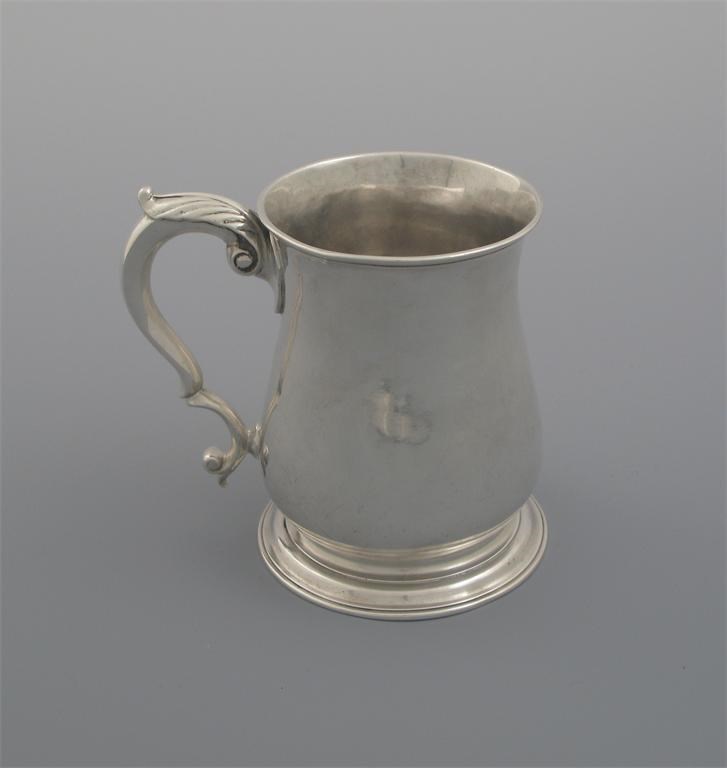 A George II plain baluster mug, on a spreading circular base, with a leaf capped, scroll handle, by John Swift, London 1747, 4.75in (12cm) high, 13oz.