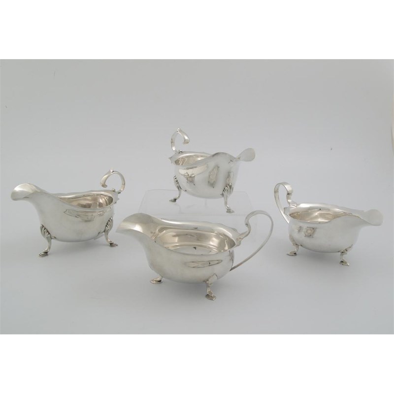 Two pairs of modern sauce boats: one pair by Stokes & Ireland, Chester 1936; the other pair slightly smaller, by Mappin & Webb, Sheffield 1935, 17oz. (4)