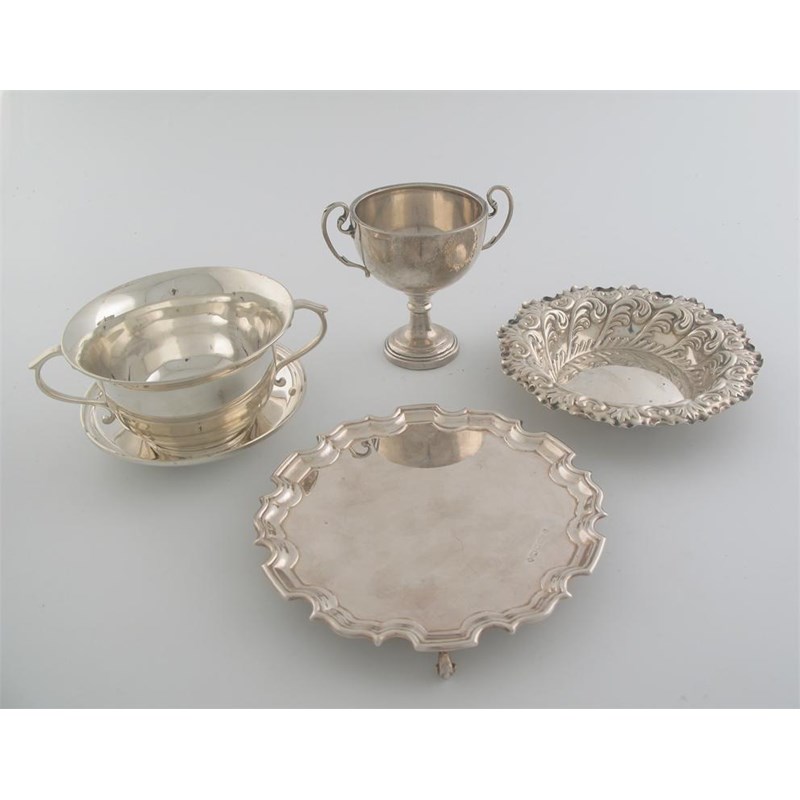 A mixed lot of silver: a small, late Victorian two handled cup and cover, London 1895, a modern waiter, a bon bon dish, two small trophy cups, a small bowl and a modern christening mug on a nursery rhyme theme, 28.5oz. (7)