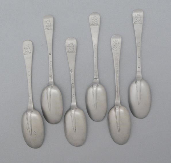 A set of six George I provincial Hanoverian table spoons, crested with thread bordered rat tails, maker's mark only, BB crowned struck thrice, possibly for Benjamin Brancker, Liverpool, 10oz. (6)