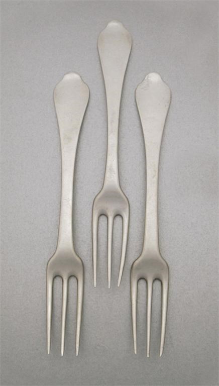 A set of eight three-prong table forks, engraved armorial's in a lozenge shields, one numbered 'No.17' and scratched 2-4, maker's mark only, by Joseph Barbutt, London, probably Queen Anne period, 16oz. (8)
