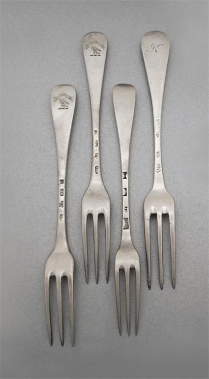 Four assorted George II Scottish three-prong dessert forks, various makers, Edinburgh 1734 to 1758, 6.5oz (4)
