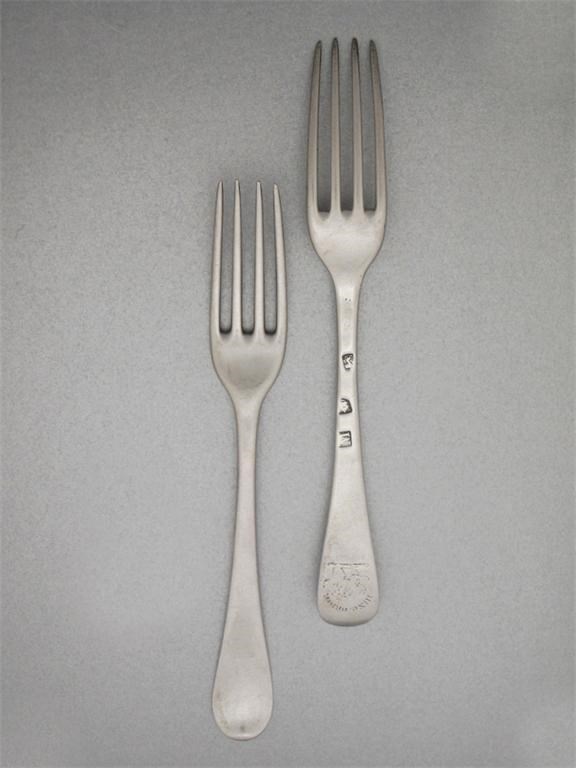A matched set of six three-prong table forks, with the crest, coronet and motto of Murray, maker's marks worn, London 1727 and 1739, together with a set of five table forks, crest and motto of Steuart or Stewart, maker's mark worn, London 1727 and a Scottish example to match, 26oz. (12)