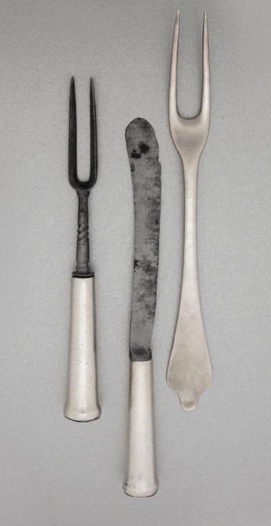 A rare Queen Anne two prong wavy-end table fork, maker's mark worn, London 1705, together with a moulded steel cannon handled dessert knife and matching two-prong fork, maker's mark only, struck once on each ('IH' pellets above and one below) last quarter of 17th century. (3) See Jackson's Revised, p.136