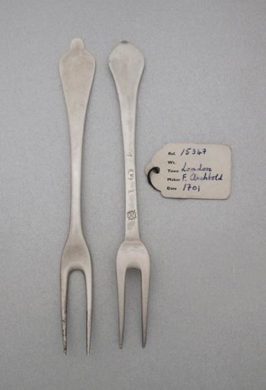 A William III two-prong table fork, with a wavy-end, maker Francis Archbold London 1701 together with a similar Queen Anne example, maker John Broake, London 1705 (date letter rubbed), 31/4oz. (2)