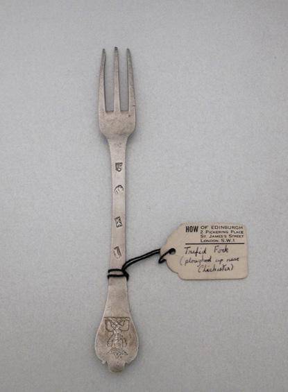 A rare James II three-prong trefid table fork, crested, maker's mark IC with pellet & cinquefoil, London 1688, 2oz. The How ticket stating, 'ploughed up near Chichester'