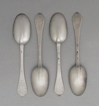 A set of four queen Anne tablespoons, with plain moulded rattails, engraved armorial, maker Joseph Barbutt, London 1705, (date letters worn), 9oz. (4)