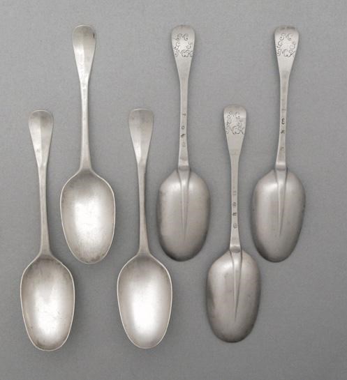 An unusual set of six early George I Scottish tablespoons, with chamfered stems and rattail bowls, maker's probably K. Mckenzie, Edinburgh 1715, 11.5oz. (6)