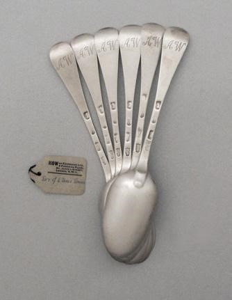 A set of six George I tablespoons, with double drops and the script initials AW, makers Philip Roker, London 1723, 13.5oz. (6)