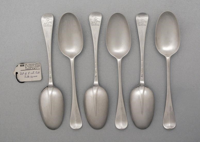 A set of six George I tablespoons, with moulded rattails, crested, maker James Morson, London 1722, 12oz. (6)