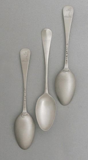 A set of three George II provincial tablespoons, with double drops, crested, maker Roger Berryman Symons of Plymouth (Exeter hallmarks for c.1759), 5oz. (3)