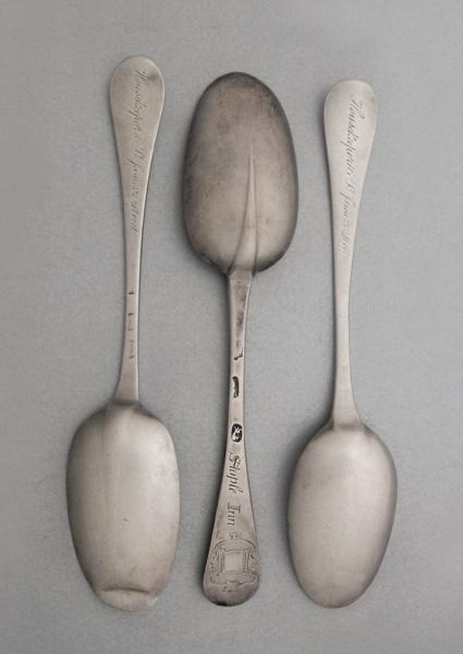 A George I table spoon, rattail with contemporary woolsack armorial and unascribed Staple Inn, makers and date letter illegible, together with two inscribed spoons, 'Housekeeper 16 St James's Street', crested, marks worn, 4.5oz. (3)