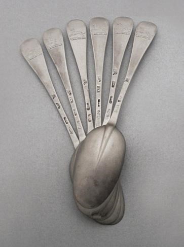 A set of six Queen Anne Hanoverian pattern dessert spoons, with plain rattails, crested, maker Lawrence Jones, London 1713, 8oz. (6)