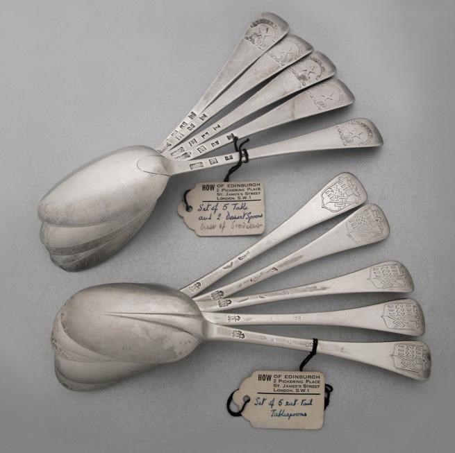 A set of five George III table spoons, with the crest of Stoddart, maker William Davie, Edinburgh 1773, together with another set of five Queen Anne spoons, with rattail bowls and armorials, maker John Broake, London 1711, 11oz. (10)