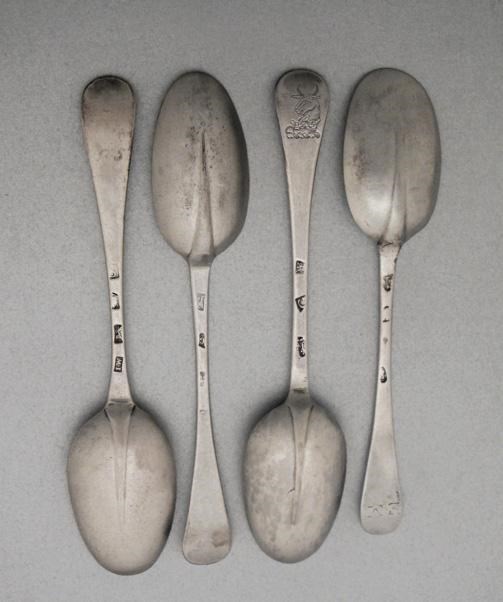 Seventeen various Hanoverian pattern dessert spoons, with plain rattails, mixed makers and dates, Queen Anne to early George II , 16oz. (17)