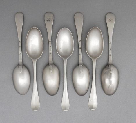 A matched set of seven tablespoons, with shaped drops to the bowls, four initialled, three plain, unascribed marks IB, FB and incuse fleur de lys, mid 18th century, 14oz. (7)
