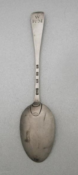 A late 18th century unascribed tablespoon, with a double drop bowl, initialled W over RM, makers D & H (?), lion passant twice and S. probably colonial, 1.5oz.