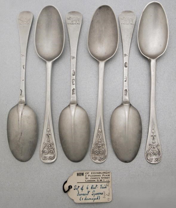 An interesting set of six Queen Anne dessert spoons, Hanoverian pattern with stamped scroll decoration on the front of the stems and plain rattails, crested, maker William Scarlett, London 1713, 5.5oz. (6)