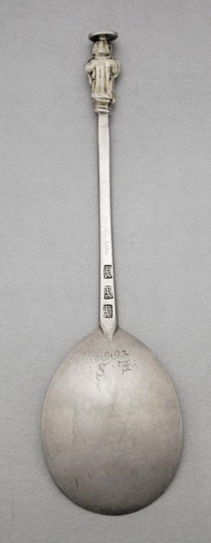 Exeter: A Commonwealth/early Charles II spoon, the gilt figure of St John, with a cup of sorrows and sacred dove nimbus, pricked ES over 1660, struck with a town mark in the bowl and on the stem thrice, with maker's mark, (E over A) for Edward Anthony, c.1660, 7.25in (18.5cm)