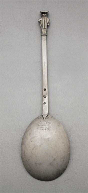 Exeter: A Charles II spoon, with a gilt figure of St Matthew with a sacred dove nimbus, the back of the bowl pricked NR over WV over 1671 struck in the bowl with a town mark, and thrice on the back of the sterm with a small pelleted quatrefoil, perhaps by William Bayley C-1671 8in (20.4cm) See Kent West Country spoons their maker's pp70 & 169 (A16) for the town mark.
