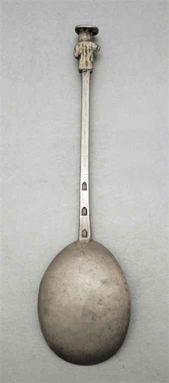 Unascribed: A Charles I spoon, the gilt figure without emblem, with a plain nimbus pricked E.S over 1662 over M.D struck once in the bowl and thrice on the stem, c.1640, 7.5in (19cm). For the marks see Jackson's Revised, p.518 as noted on a seal-top spoon, c.1640 and previously ascribed to Rochester