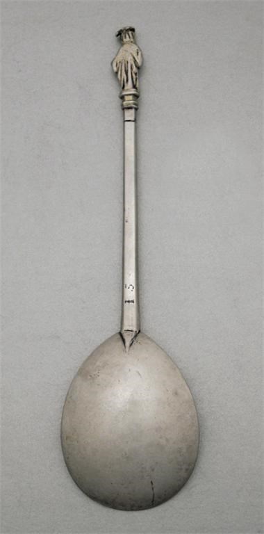 Unascribed: A 15th/16th century spoon, the gilt figure lacking emblem with damaged spoked nimbus, scratched IS on the stem and struck in the bowl with a leopards head mark, 7.5in (19.2cm). For the mark see Jackson's Revised, p.527