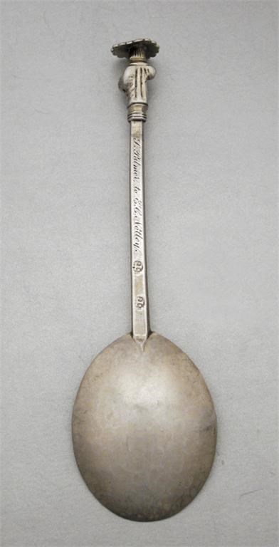 Salisbury: An early Charles II silvergilt spoon, the figure lacking emblems with a large polyfoil nimbus, pricked IG over 1664 over IP, the stem later inscribed S. Palmer to E.C Notley, struck once in the bowl and twice on the stem with the maker's mark of Thomas Thornburgh, c.1664, 7.45in (18.9cm)