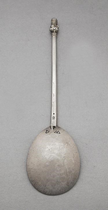 Dorchester: An Elizabeth I spoon, with a gilt maidenhead, incuse WG on the back of the bowl, struck on the stem with a small cross and a small mullet and in the bowl with the maker's mark, LS monogram, of Lawrence Stratford, c.1585, 6.7in (16.9cm)