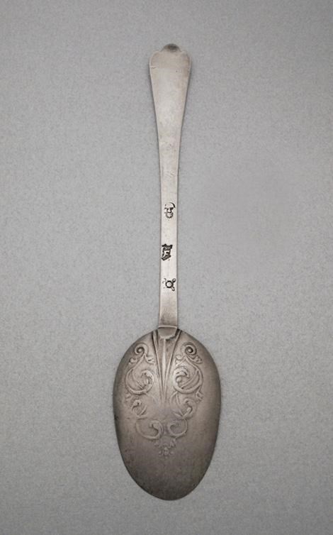 A William and Mary spoon, with a tapering stem, crudely pricked 'C.P over 1691', maker Francis Glanville, Launceston, c.1691, 6.8in (17.7cm).