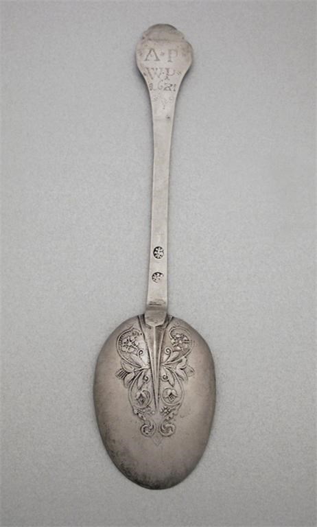 A late Charles II spoon, with 'guide lines' on the front of the stem, pricked 'A.P' over 'W.P' over '1681', maker John Elderton, Frome, c.1681, 7.8in (19.8cm).