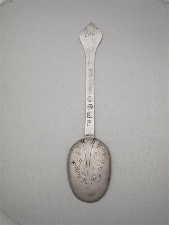 A William III spoon, scratched 'G' over 'TK', maker unascribed, probably Poole ('P', dolphin, 'P', dolphin), c.1695-1700, 7.8in (19.9cm).
