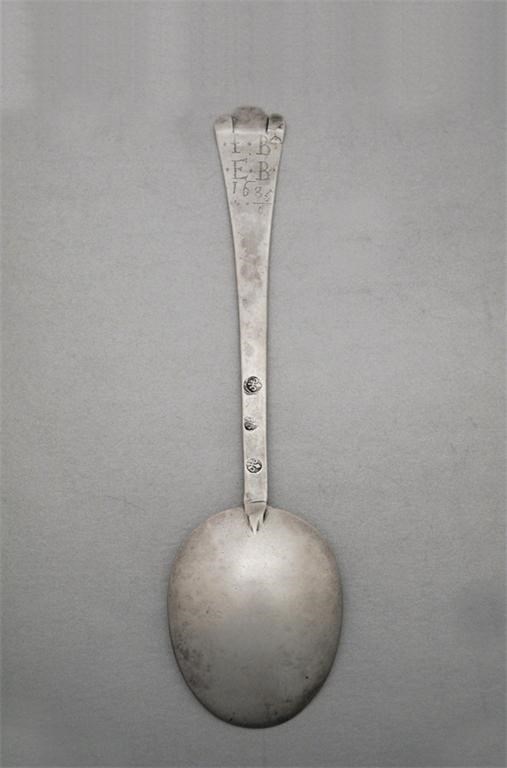 A James II spoon, with a stylised tulip pricked 'I.B, E.B 1685/6', maker unascribed (a fleur de lys circular mark struck four times), probably Wiltshire/Somerset, c.1685/6, 7.7in (19.5cm).